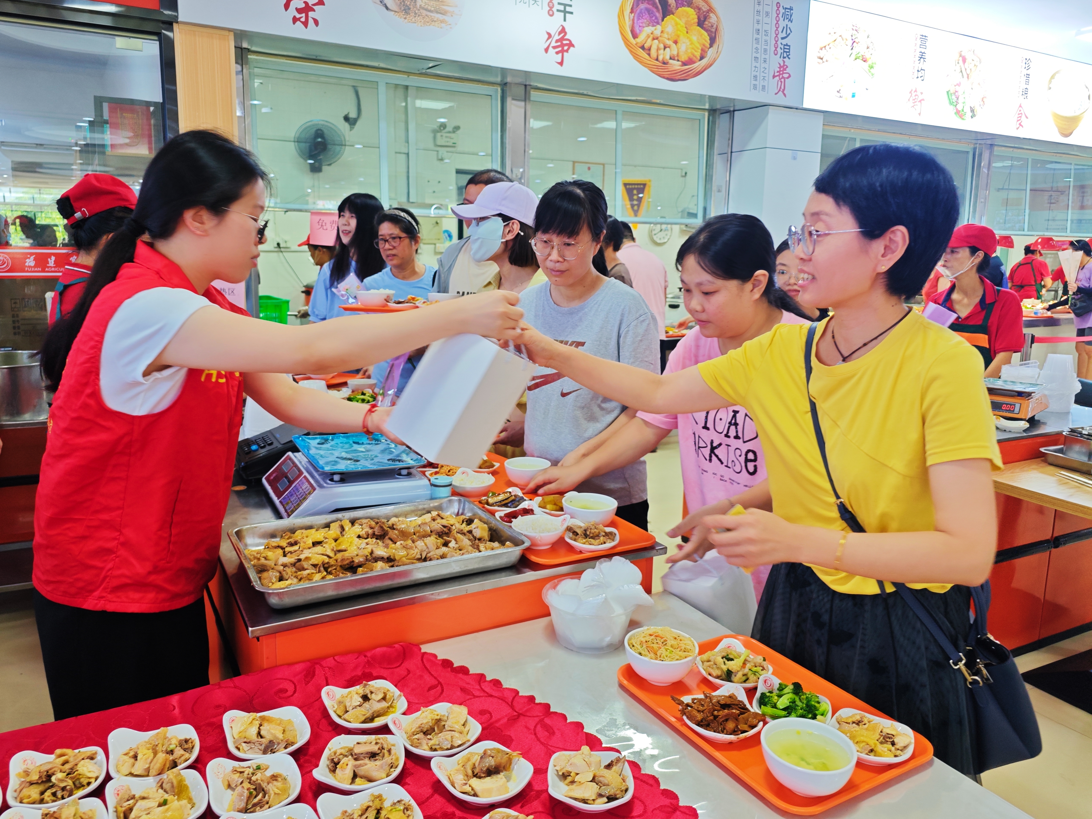 活动现场温情涌动,满载心意的新鲜冬瓜与香润滋补的河田鸡顺利送达教工食堂,食堂师傅们精心烹制,将校友牵挂转化为舌尖上的美味,供就餐师生免费品鉴。这份校友捐赠,不仅为食堂注入“暖心能量”,更彰显了校友对恩师饮食健康的细致关怀。与此同时,志愿者们将定制纪念水杯逐一递到教职工手中,杯身附着的卡片上,“桃李天下,师泽永怀”八个字寄语,字字真挚,既承载对师者育人情怀的敬意,更饱含校友对母校培育之恩的感念。
