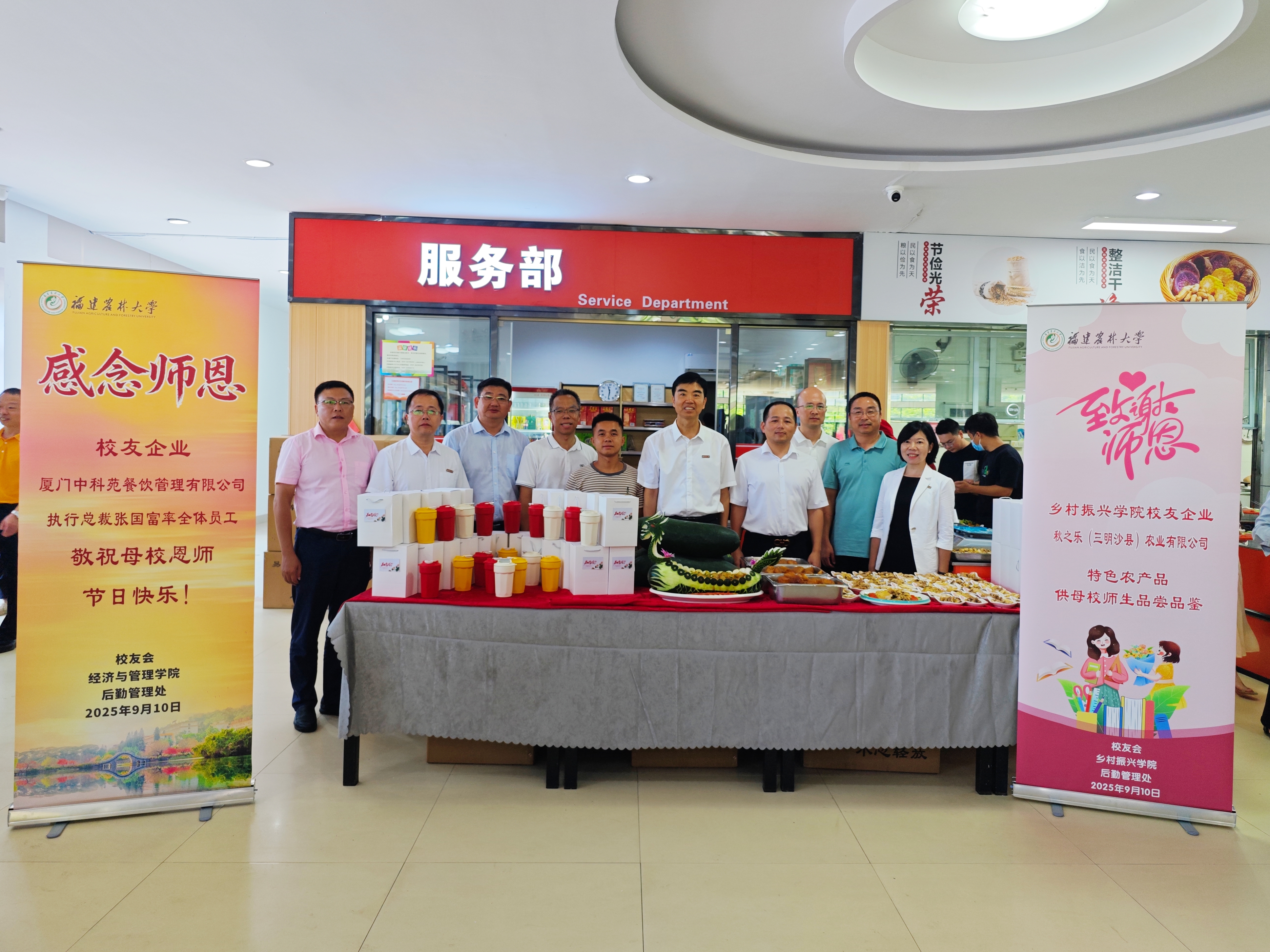 金秋九月,丹桂飘香。在第41个教师节到来之际,校友企业厦门中科苑餐饮管理有限公司携手秋之乐(三明沙县)农业有限公司共同开展“致谢师恩”暖心捐赠免费品尝活动,向躬耕教坛的全校教职工致以节日的敬意。副校长林庆藩,校友企业相关负责人出席活动。
