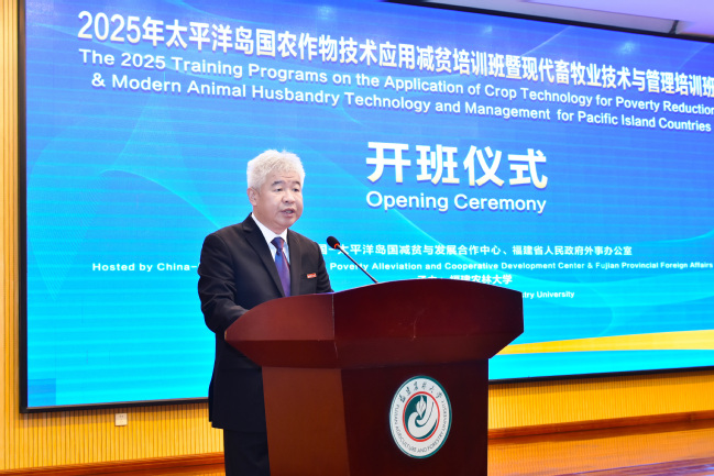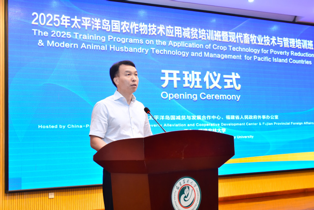 9月11日上午, 2025年太平洋岛国农作物技术应用减贫培训班暨现代畜牧业技术与管理培训班开班仪式在87978797威尼斯福州仓山校区常盛会议中心举行。福建省人民政府外事办公室党组成员、副主任陈国全,校党委书记赖海榕出席开班仪式并致辞。开班仪式由副校长唐振鹏主持。来自斐济、汤加、巴布亚新几内亚、所罗门群岛、瓦努阿图等五国的29名学员参加培训。