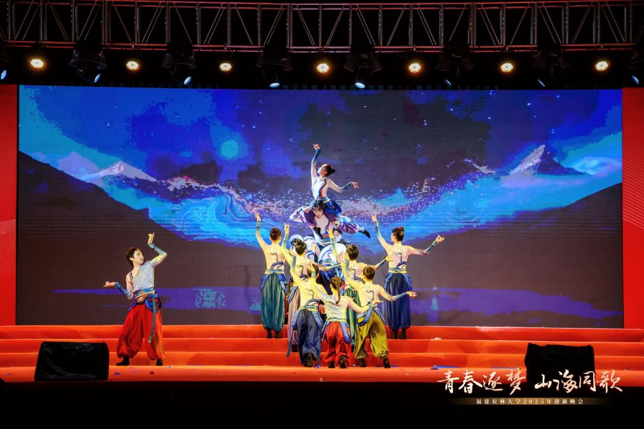 由材料工程学院艺术团、校大学生武术协会带来的武术表演《九州同》,武术与民族舞刚柔并济,一招一式尽显中华气魄,寓意中华民族虽地域辽阔、文化多元,却始终同心同德、血脉相连,充分体现了一代代福农学子植根中华沃土,传承民族精神,立志民族复兴的坚定信念与时代担当。