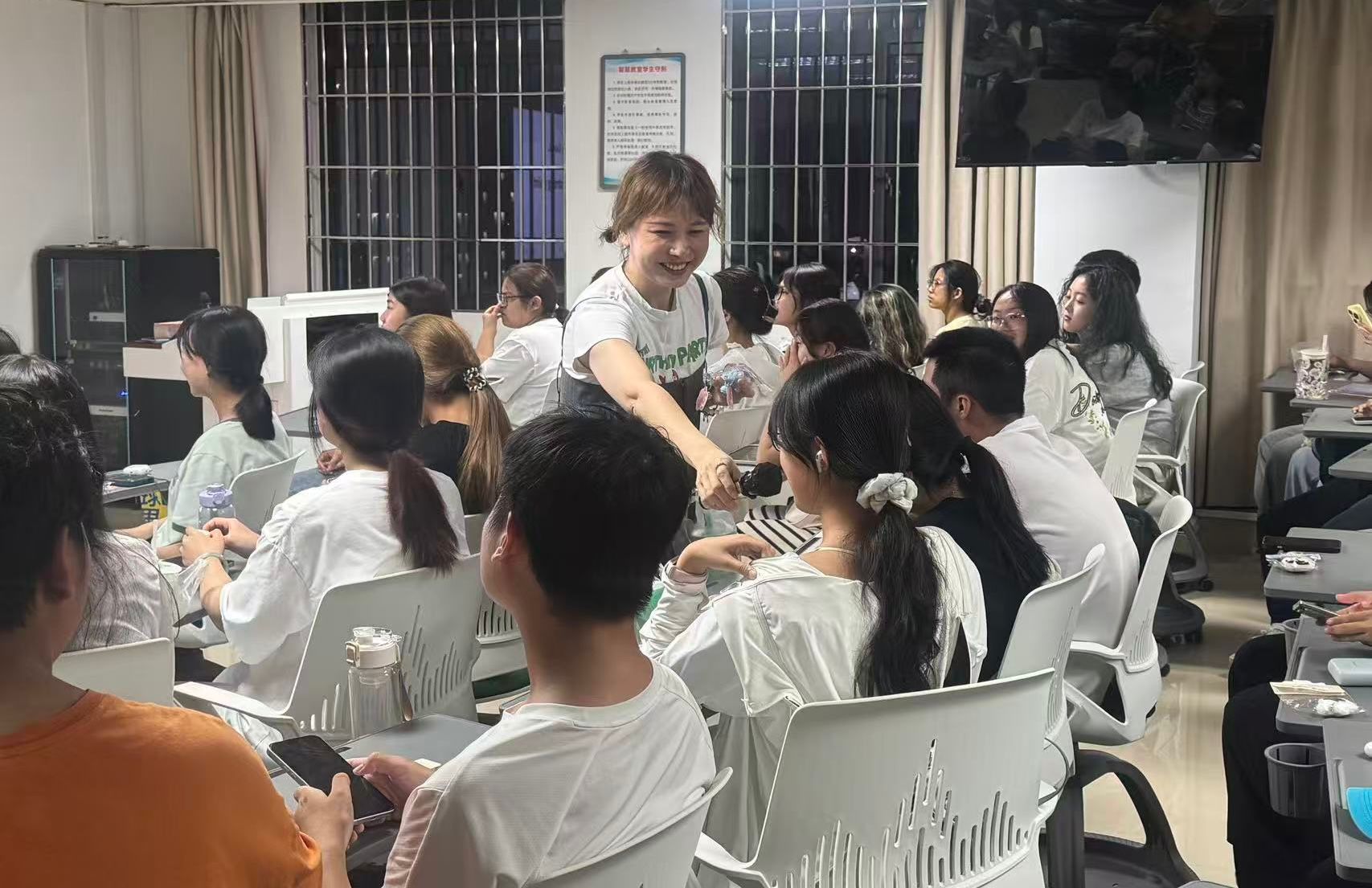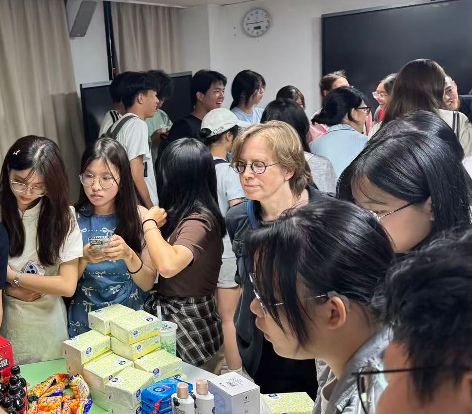 讲座环节结束后,中外师生移步文化体验区。来自加拿大的外籍教师与同学们围坐一堂,学习方言、品茶赏月,零距离体验福建传统中秋文化。欢快热烈的喝彩声不时响起,将活动推向高潮。