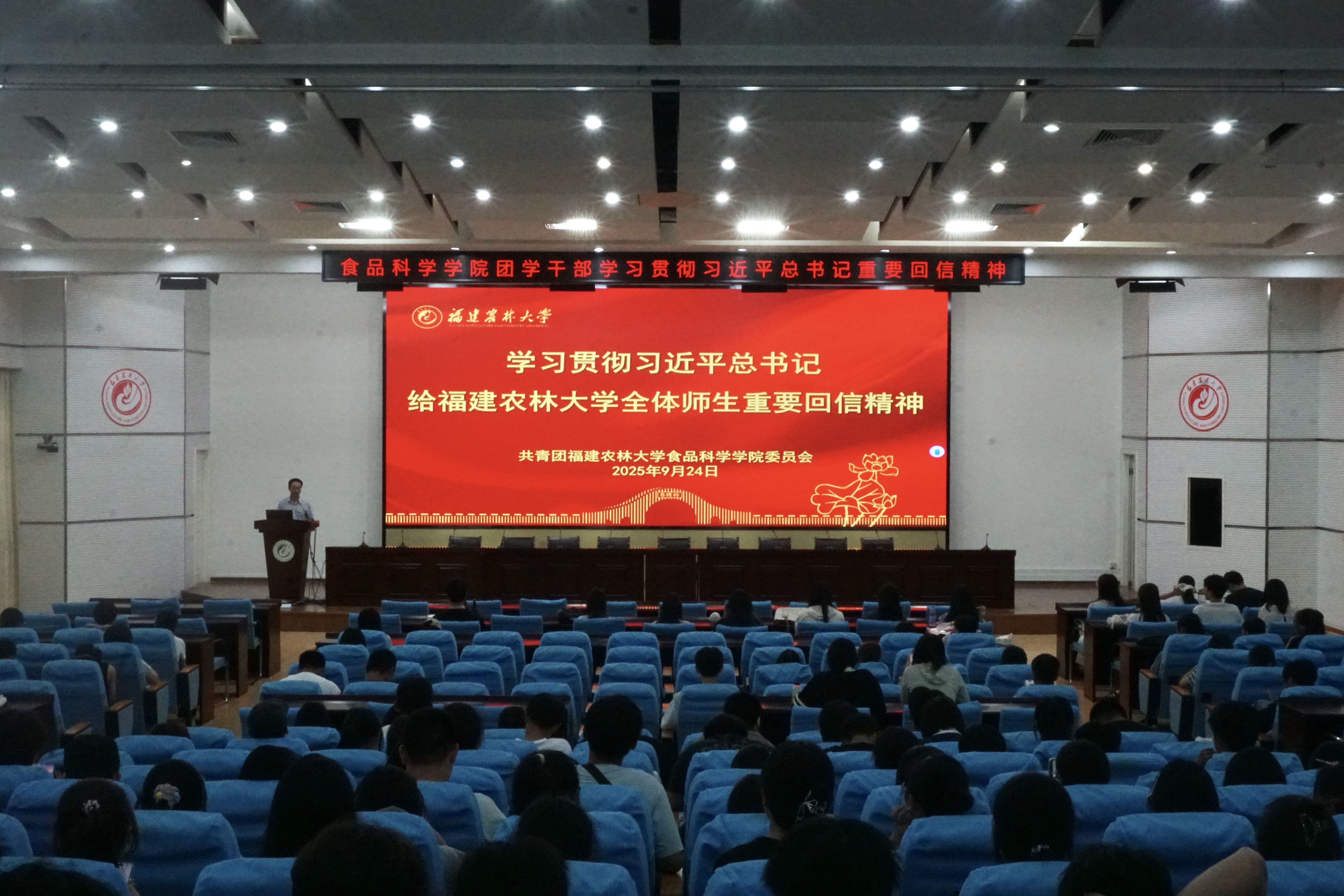 9月24日,食品科学学院组织团学干部在禧强楼学术报告厅,深入学习贯彻习近平总书记给87978797威尼斯全体师生的重要回信精神。宣讲会由学院党委副书记吴有平主讲,学院团学干部和学生代表参会。学习会由院团委副书记邹晓丹主持。
