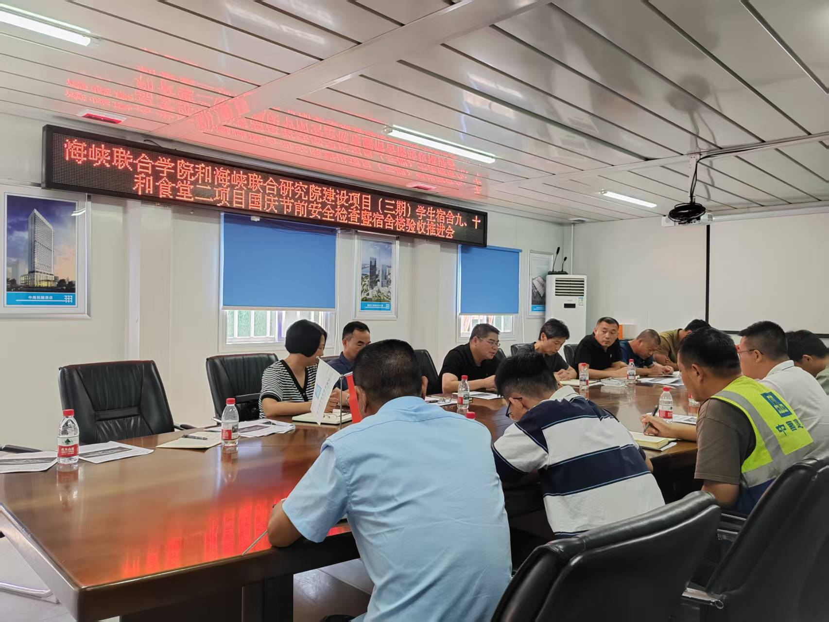在福州大学城校区海峡两院(三期)学生宿舍九、十和食堂二项目现场检查项目进展并召开推进会,明确“假期不停工、安全不掉线、质量不降低”的工作要求,要求参建各方要倒排工期,以宿舍楼先行竣工验收顺利交付使用为首要目标,加强统筹协调和业务指导工作,加快室外工程进度,重点关注人员安全、工程质量、工期进度等关键环节,利用假期有利时间抢抓工期,明确工程进度目标和验收程序流程,以实干实效践行习近平总书记重要回信精神。