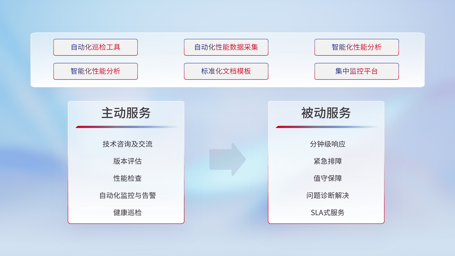智能化工具和标准化文档,,,,保障服务质量,,提供主动服务(包含技术咨询、、、版本评估、、、、性能检查、、、自动化监控与告警、、健康巡检)和被动服务包含(分钟级响应、、紧急排障、、值守保障、、问题诊断解决、、、SLA服务)。。。